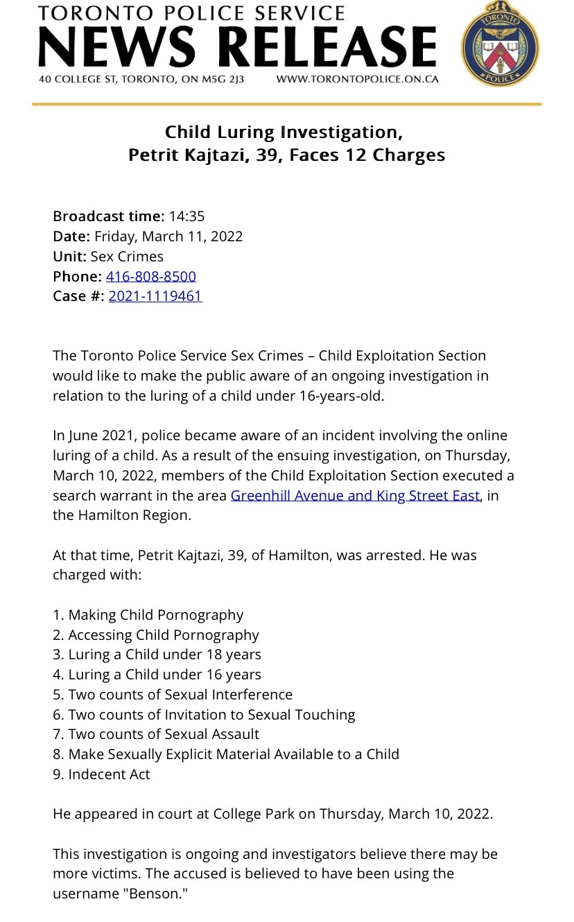 His catch video: https://pptoronto.locals.com/upost/7418159/petrit-katazi-was-arrested-after-this-catch-for-sexual-crimes-with-another-minor